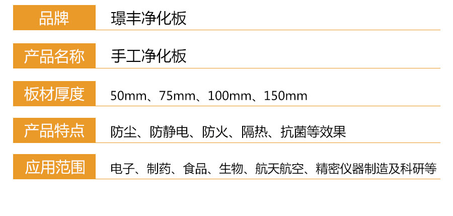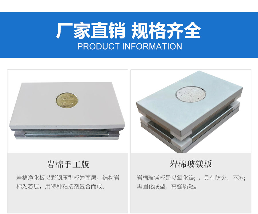 手工巖棉凈化板兩面采用鋼板,四周采用冷彎型材框架,芯材可用無機質的巖棉或玻鎂板夾巖棉。該產品表面平整美觀、隔音、絕熱、保溫、抗震、防火性能好、幾何尺寸準確、安裝方便、省時省工。